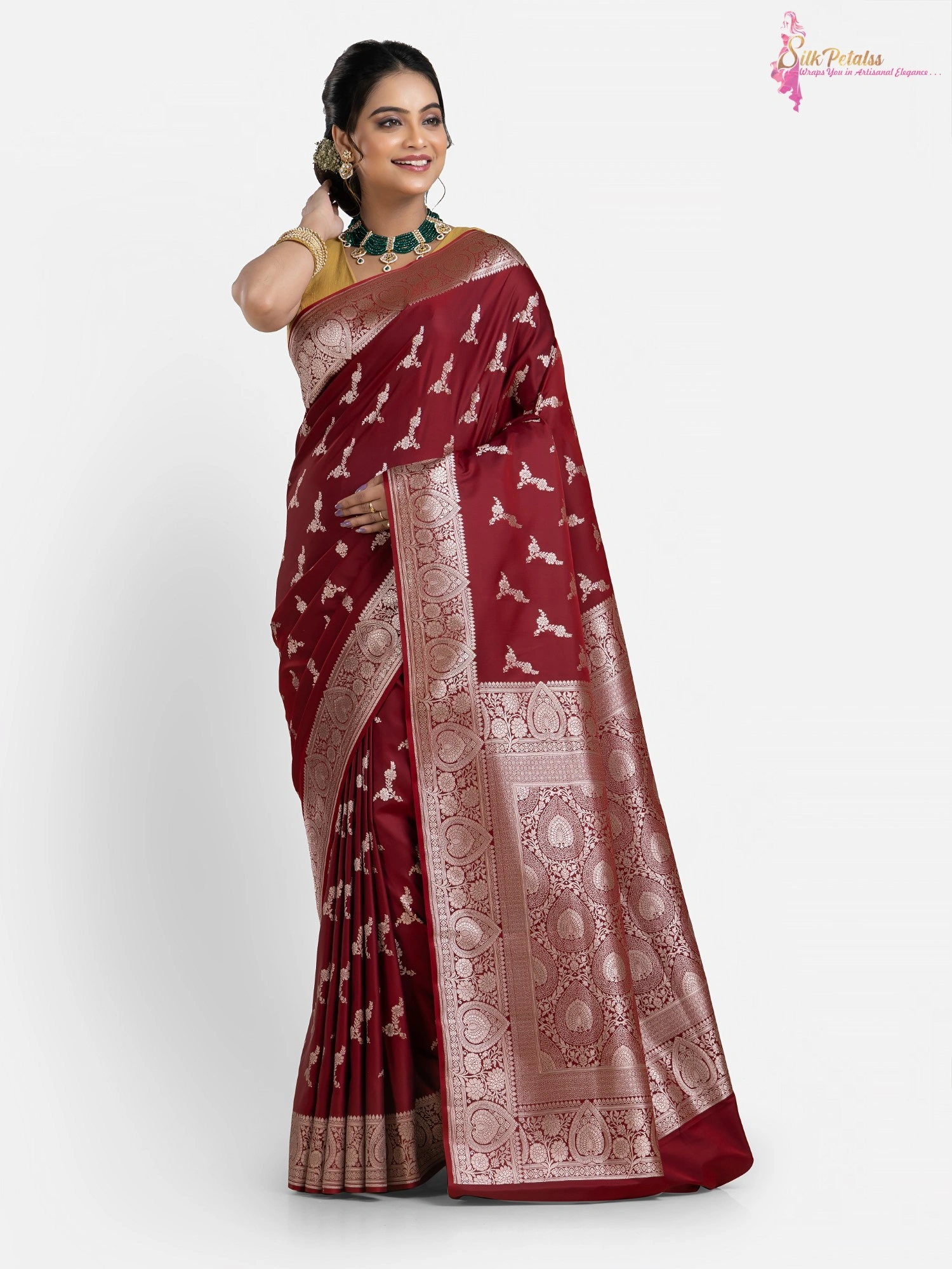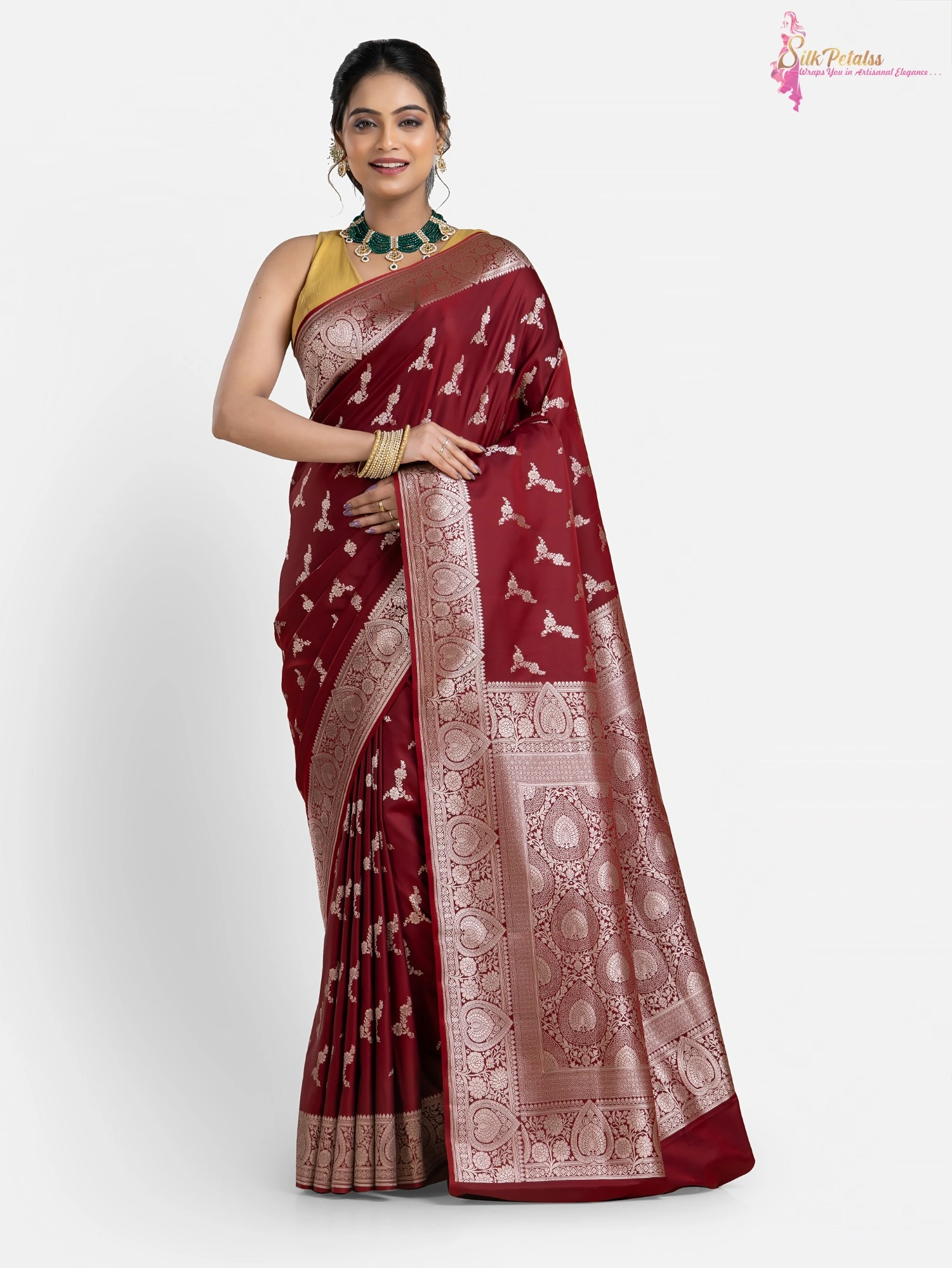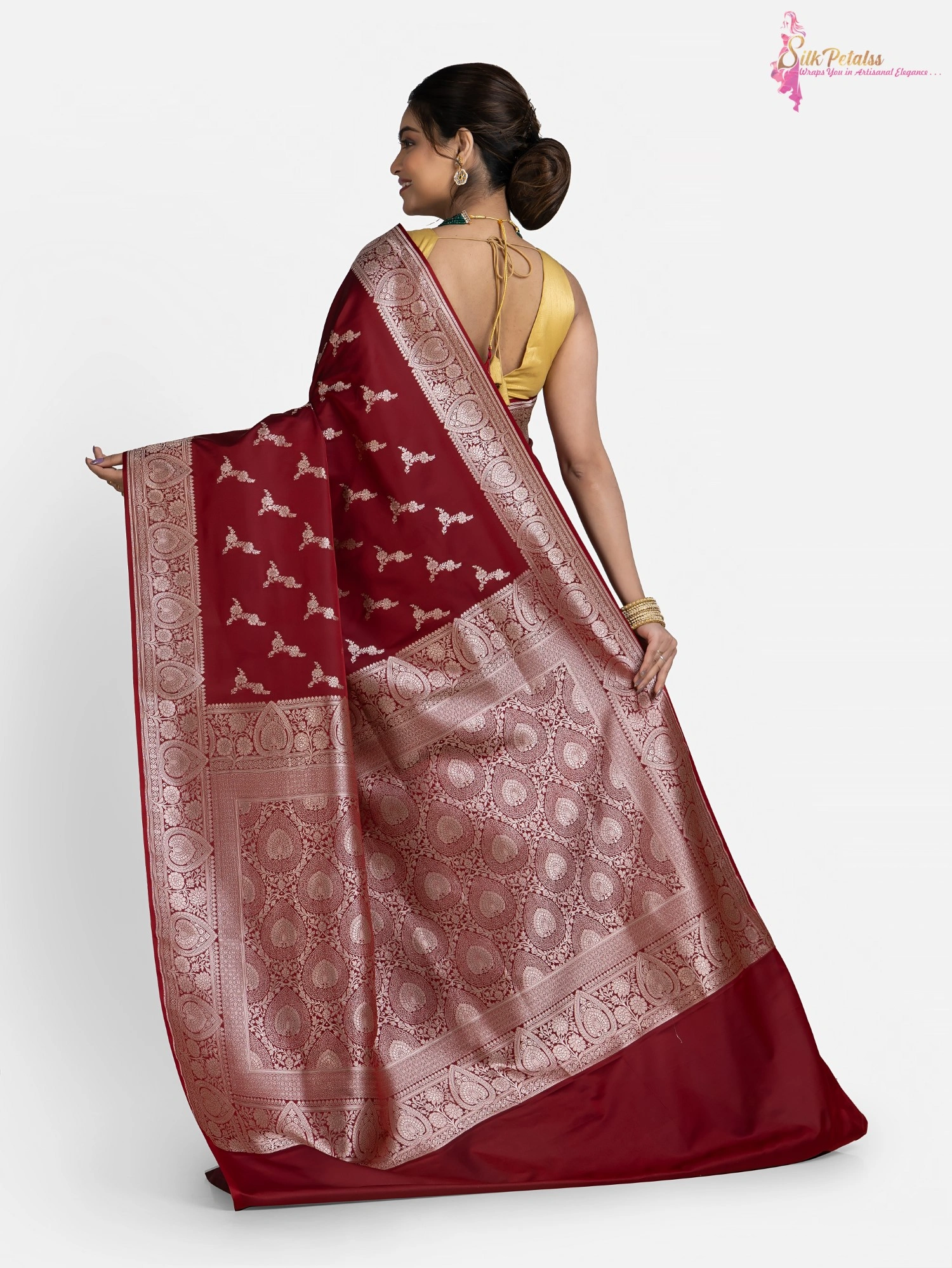 This handwoven Katan Benarasi Silk saree in a soft rust colour has woven motifs all over in silver colour and an intricately designed border. Wear this very elegant saree to those special occasions to stand out in a crowd.