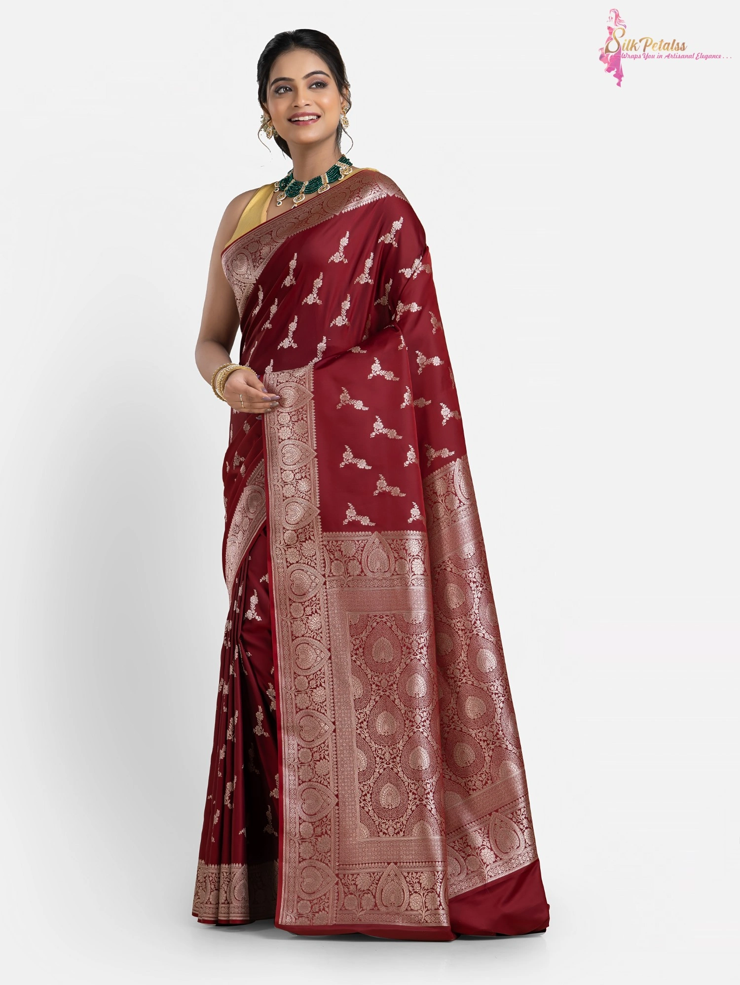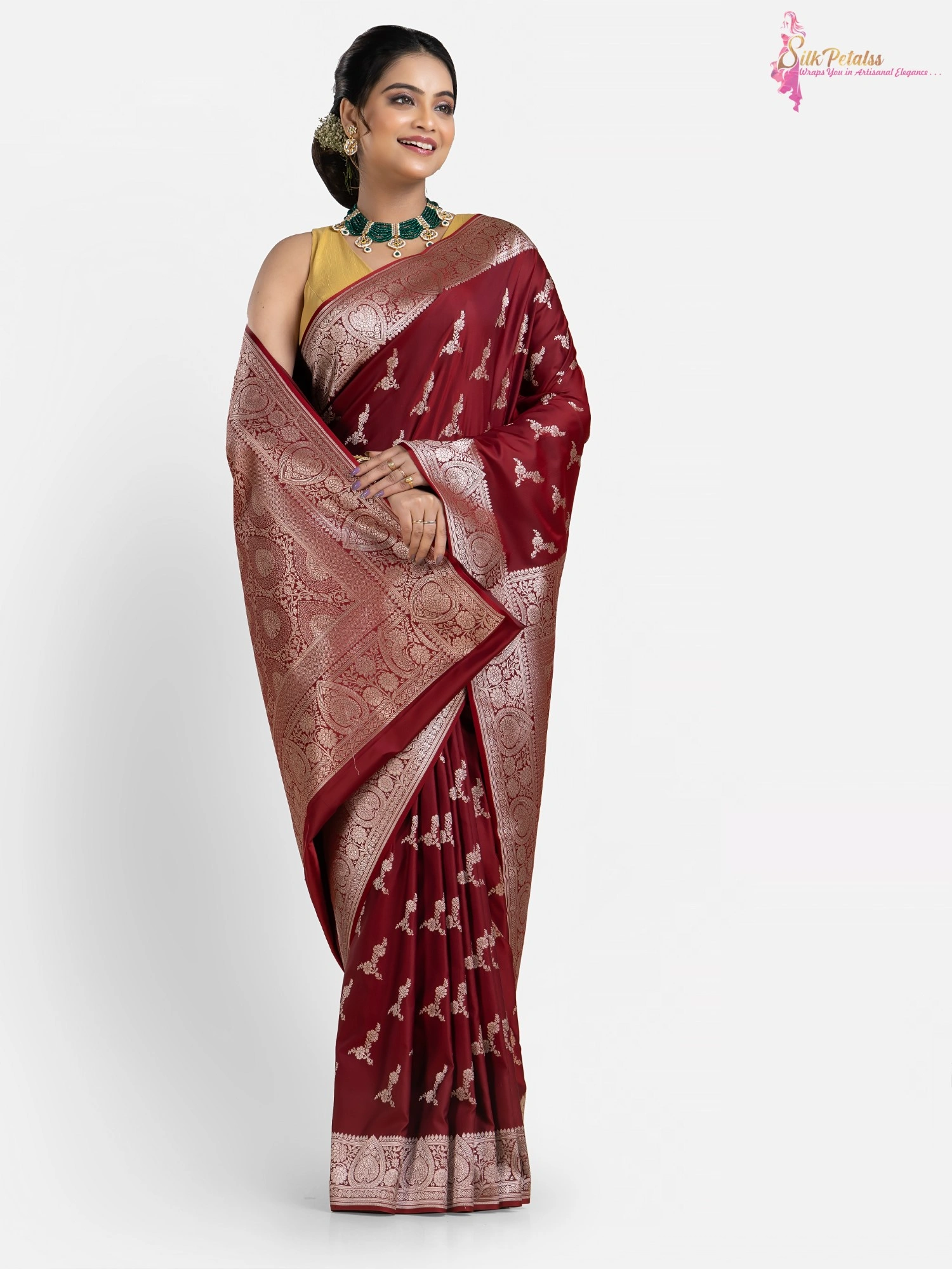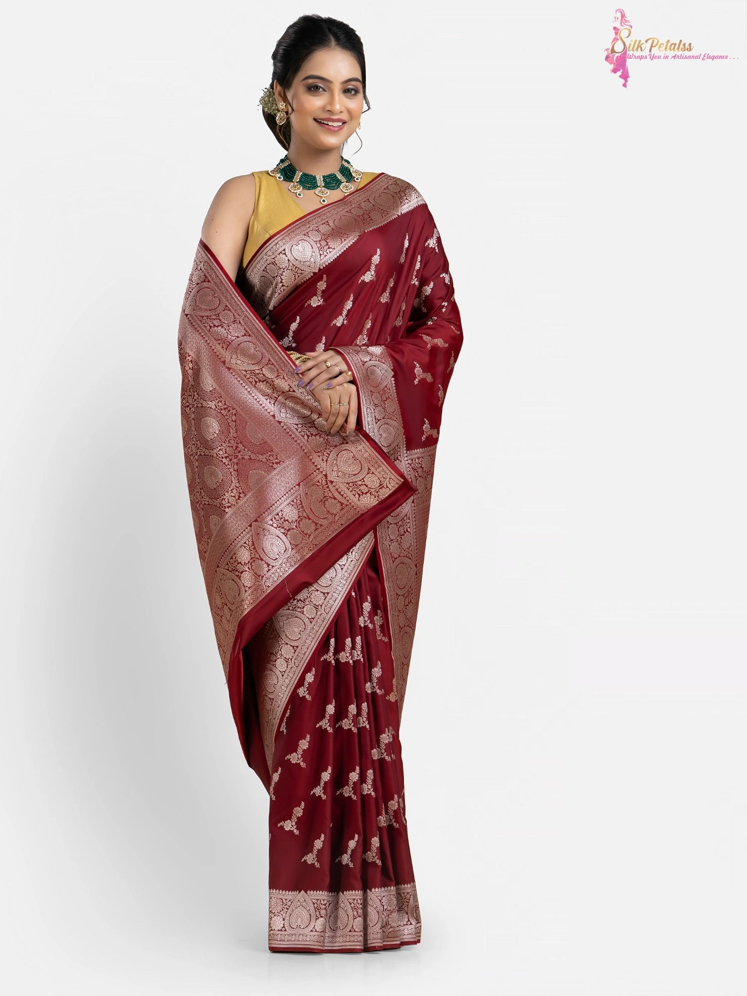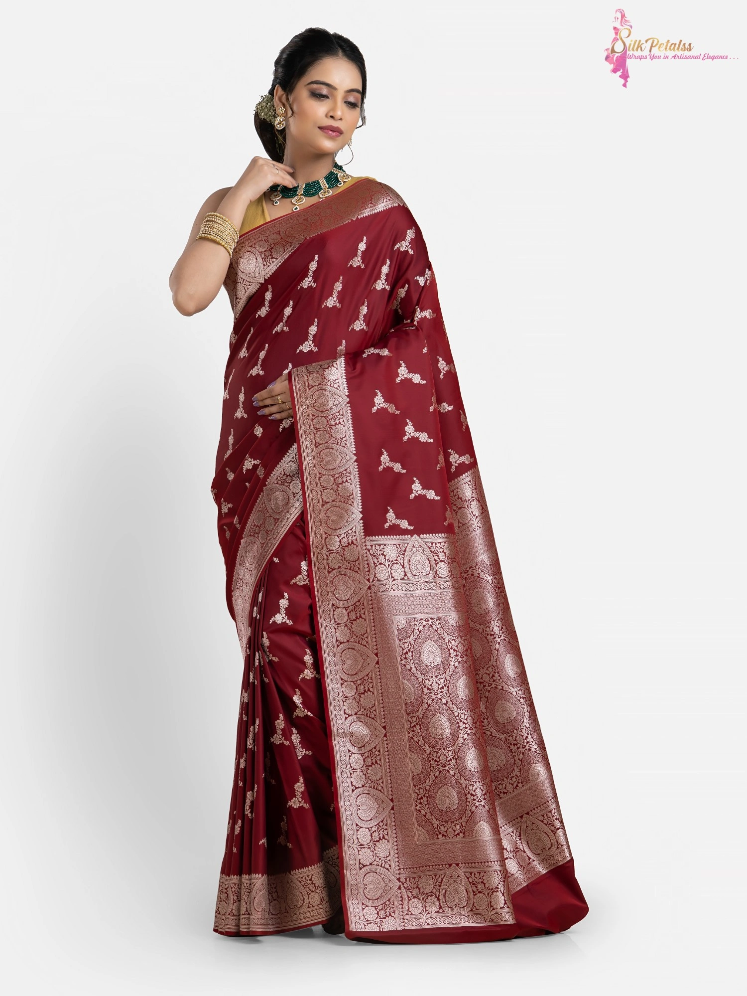 This handwoven Katan Benarasi Silk saree in a soft rust colour has woven motifs all over in silver colour and an intricately designed border. Wear this very elegant saree to those special occasions to stand out in a crowd.