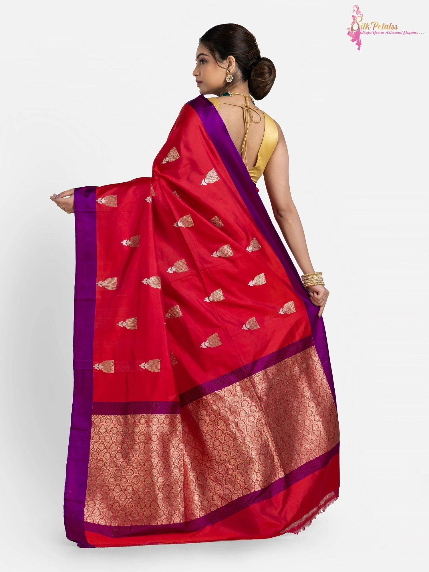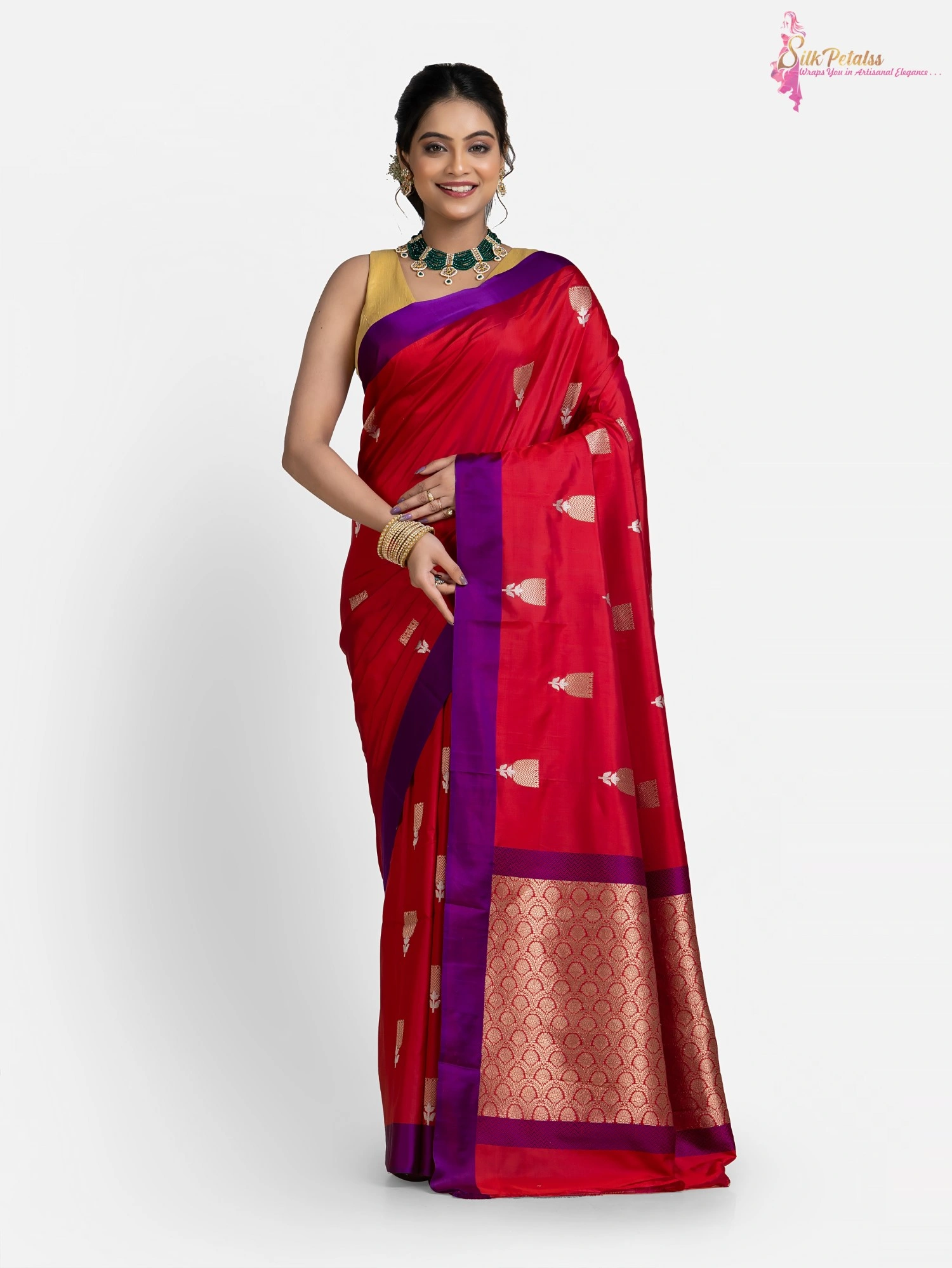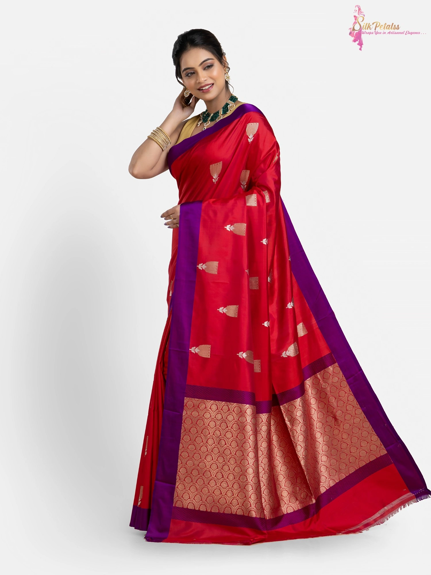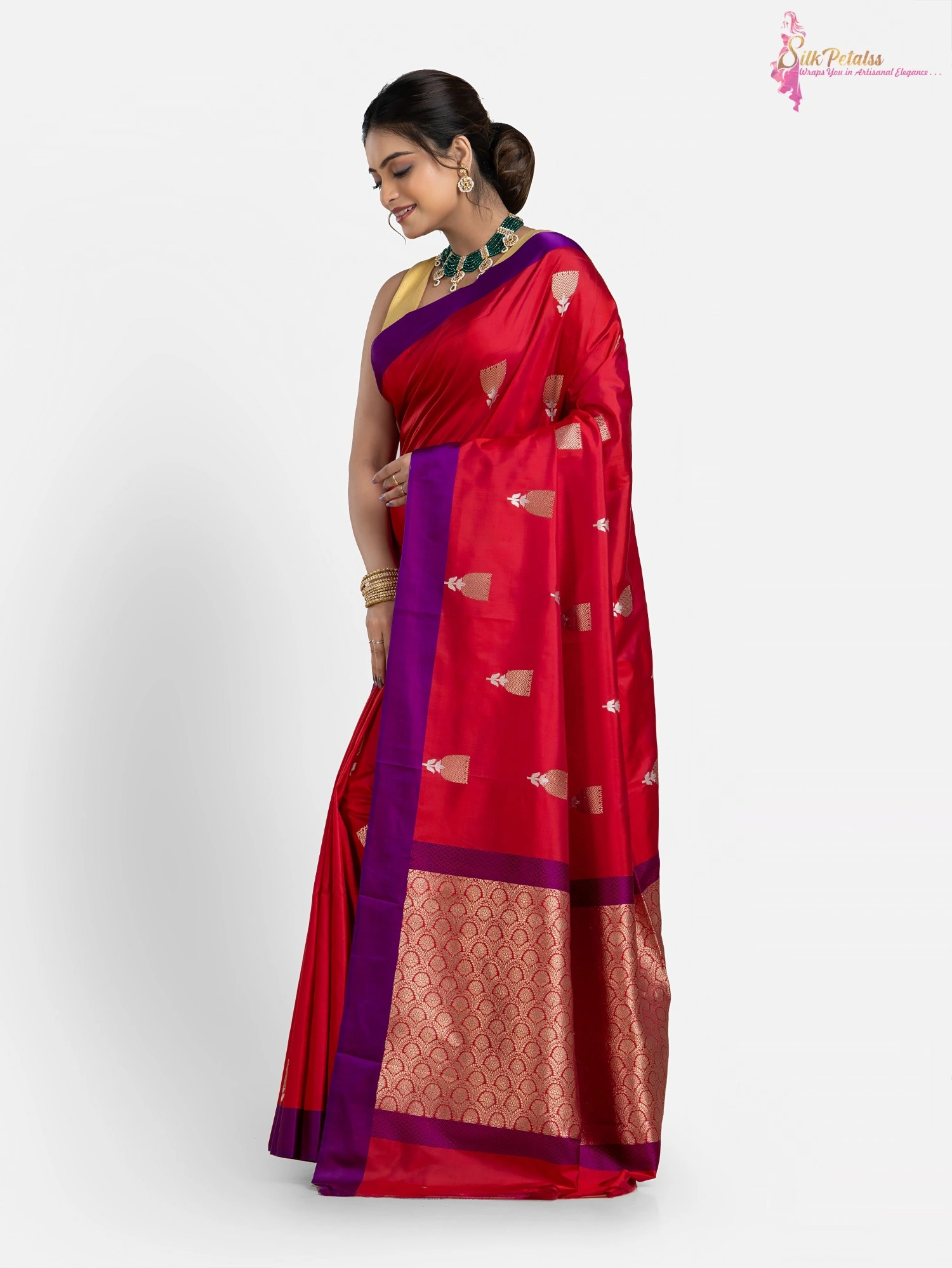 This handwoven pure Katan Benarasi Silk saree in a soft red colour has woven butas all over in sona rupa colours and a purple border. This very elegant and stylish saree comes with Silk Mark Certification. Wear it to those special occasions to stand out in a crowd.