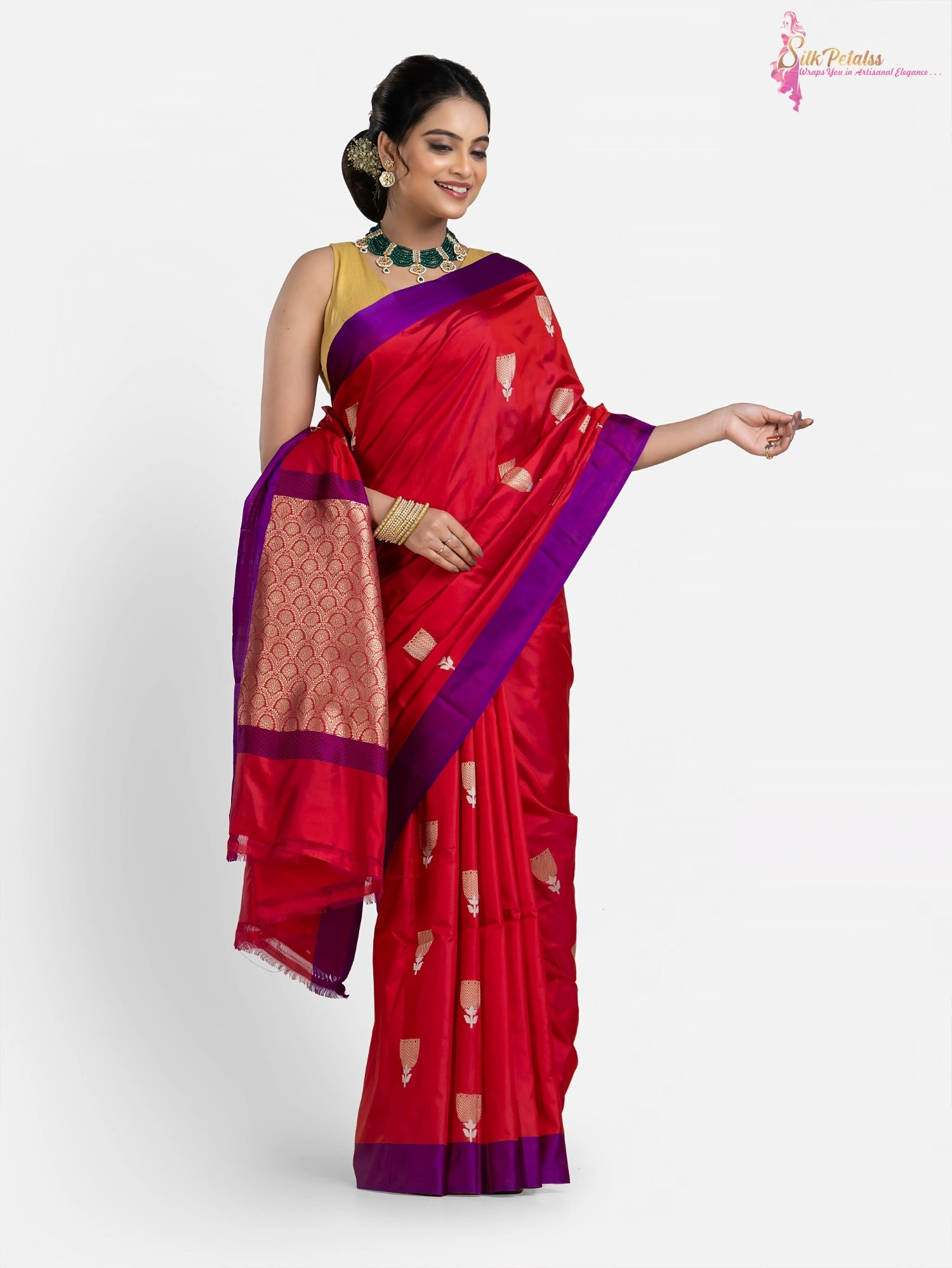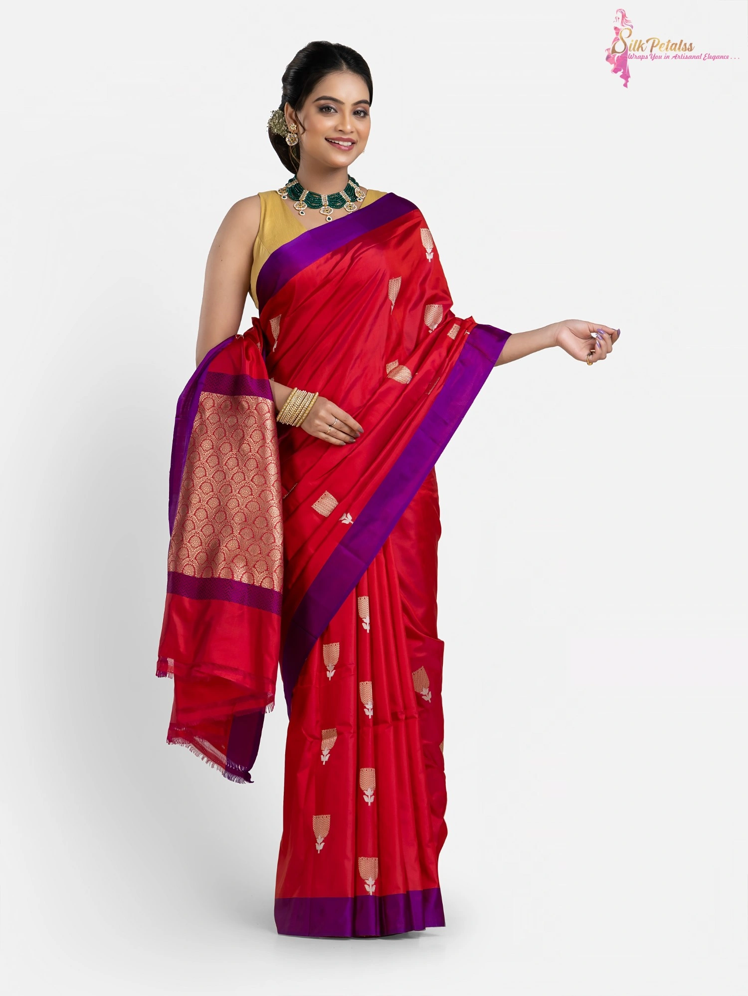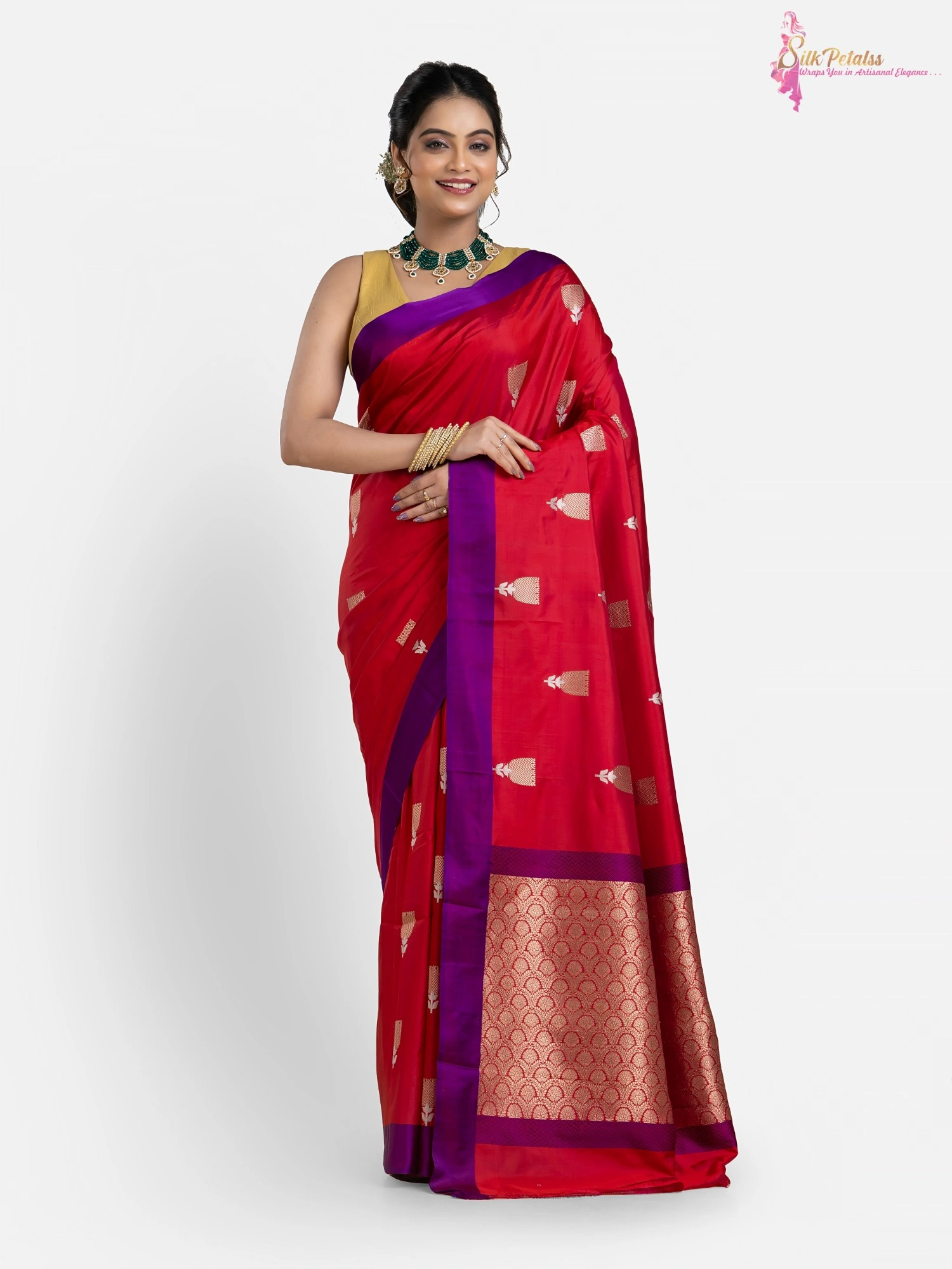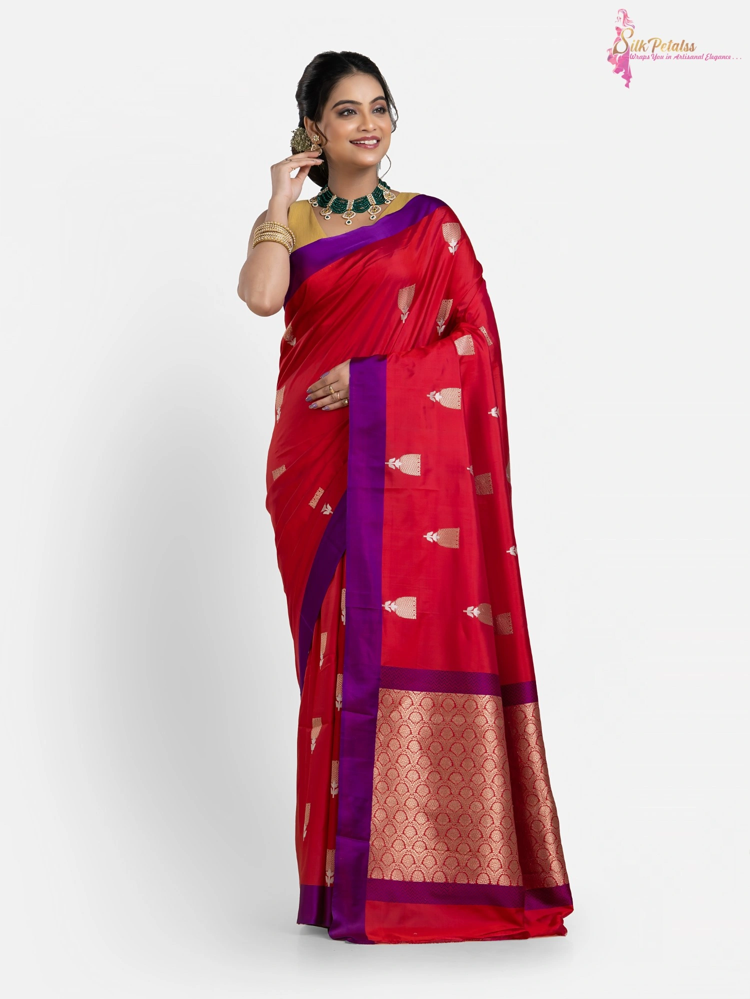 This handwoven pure Katan Benarasi Silk saree in a soft red colour has woven butas all over in sona rupa colours and a purple border. This very elegant and stylish saree comes with Silk Mark Certification. Wear it to those special occasions to stand out in a crowd.