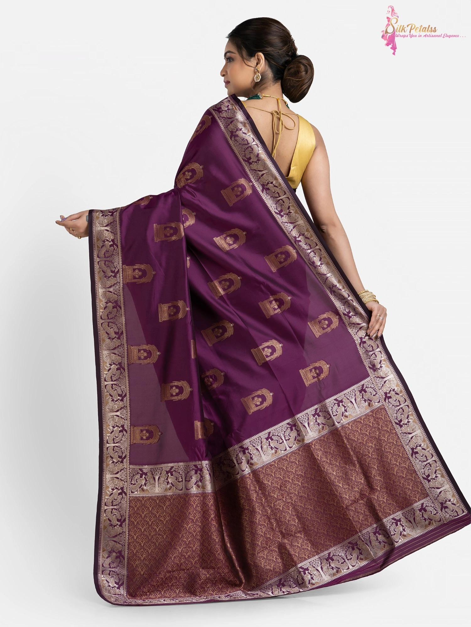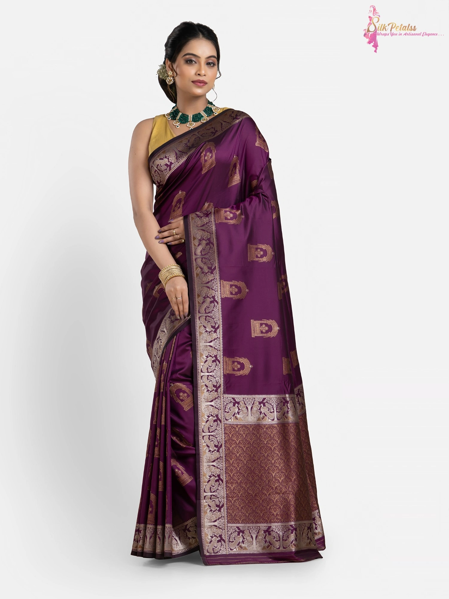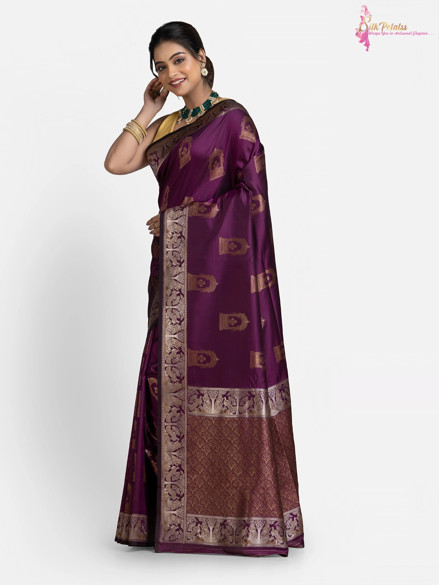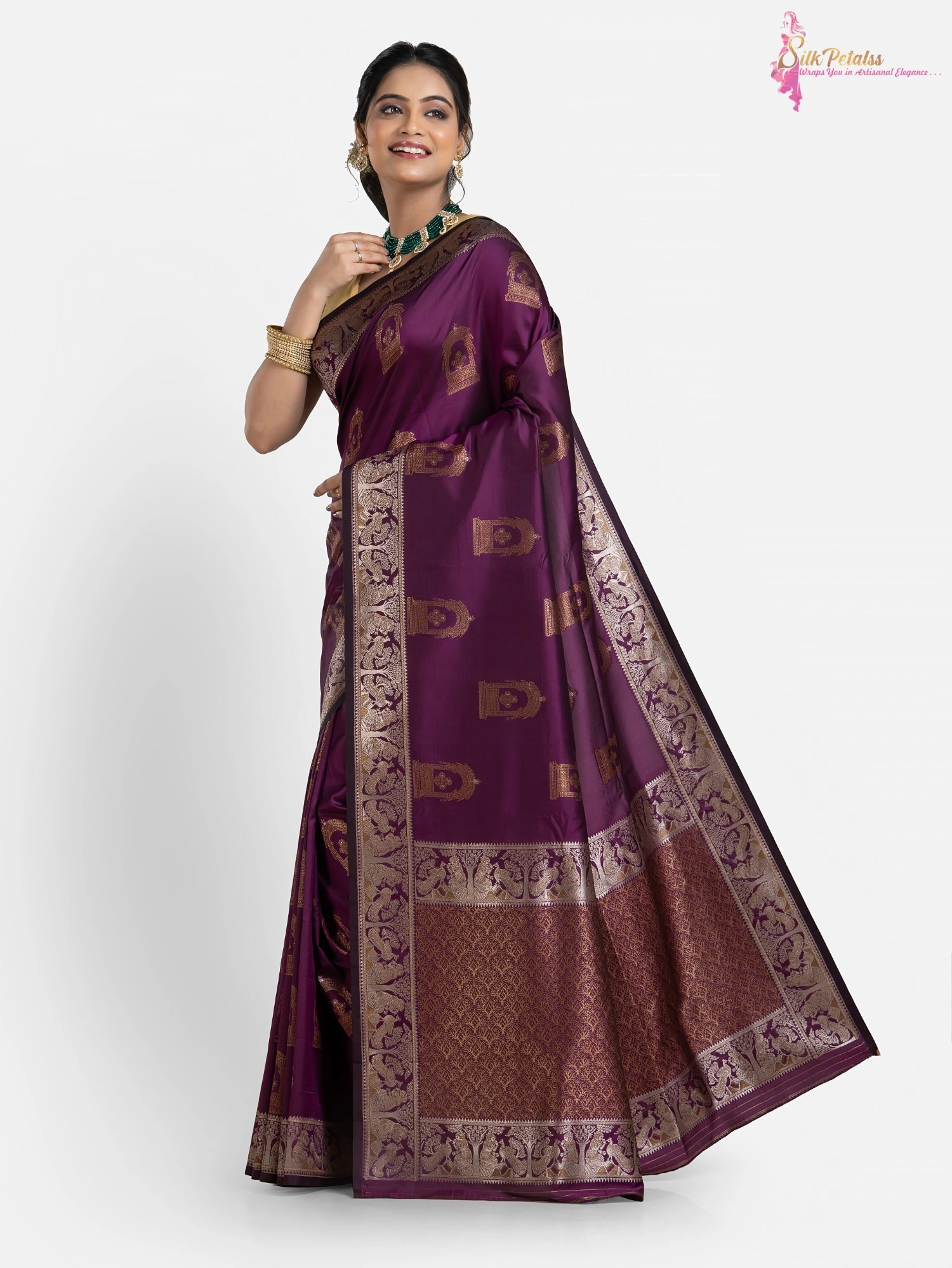 This handwoven Katan Silk saree in a soft purple colour has woven sona rupa butas all over in Baluchari pattern with a beautiful intricately worked border. Wear this very unique and stylish saree to those special occasions to stand out in a crowd.