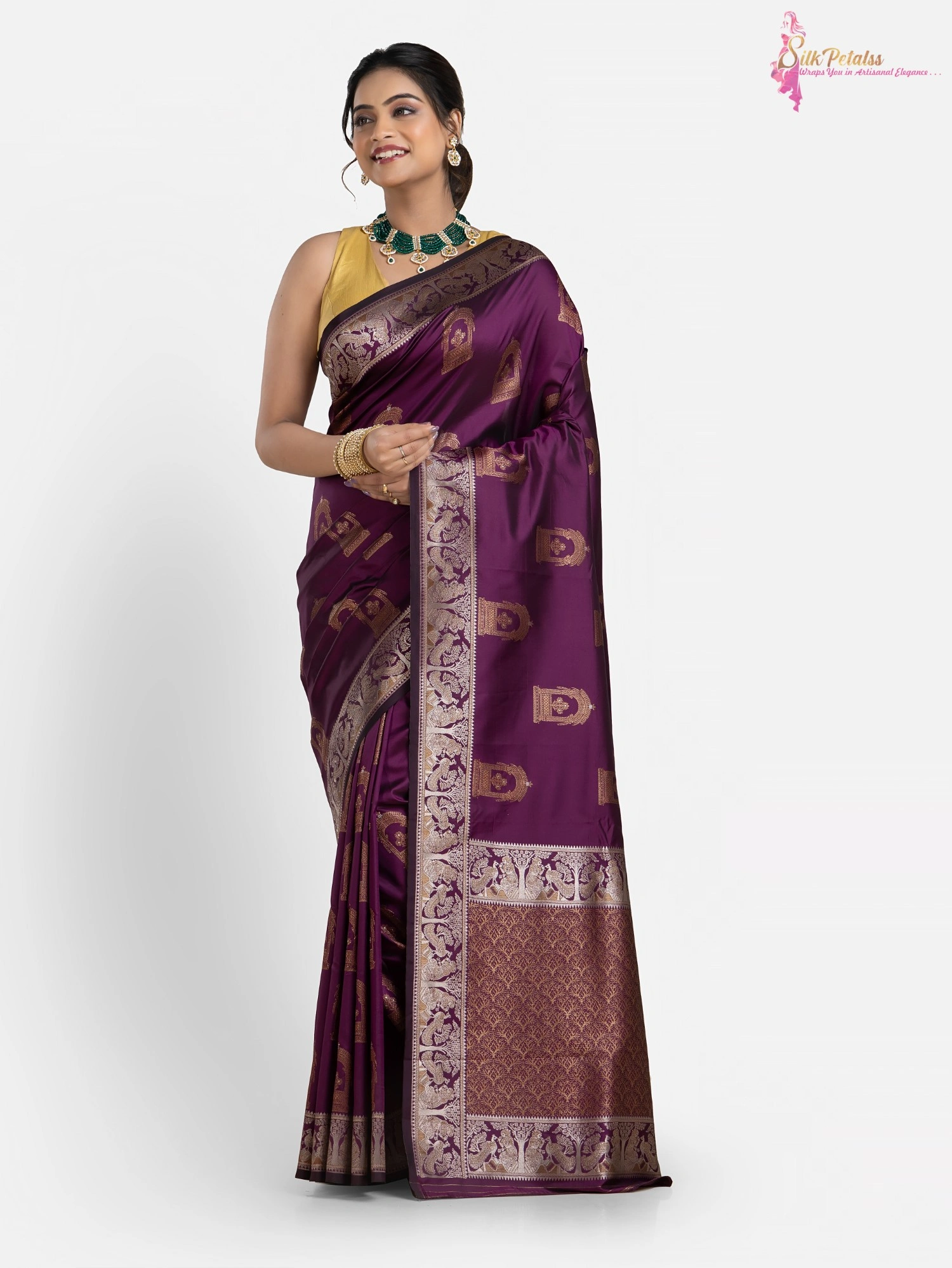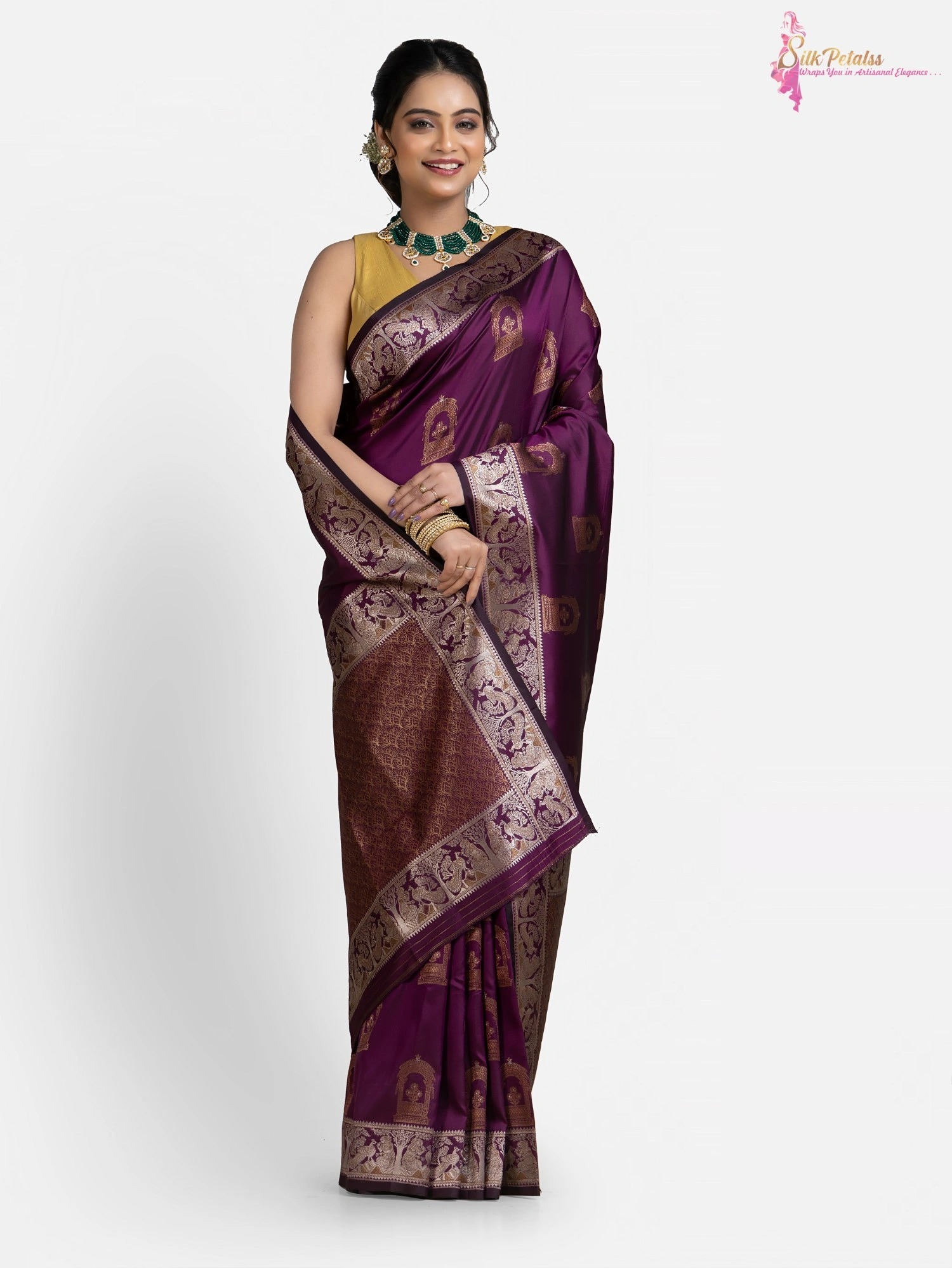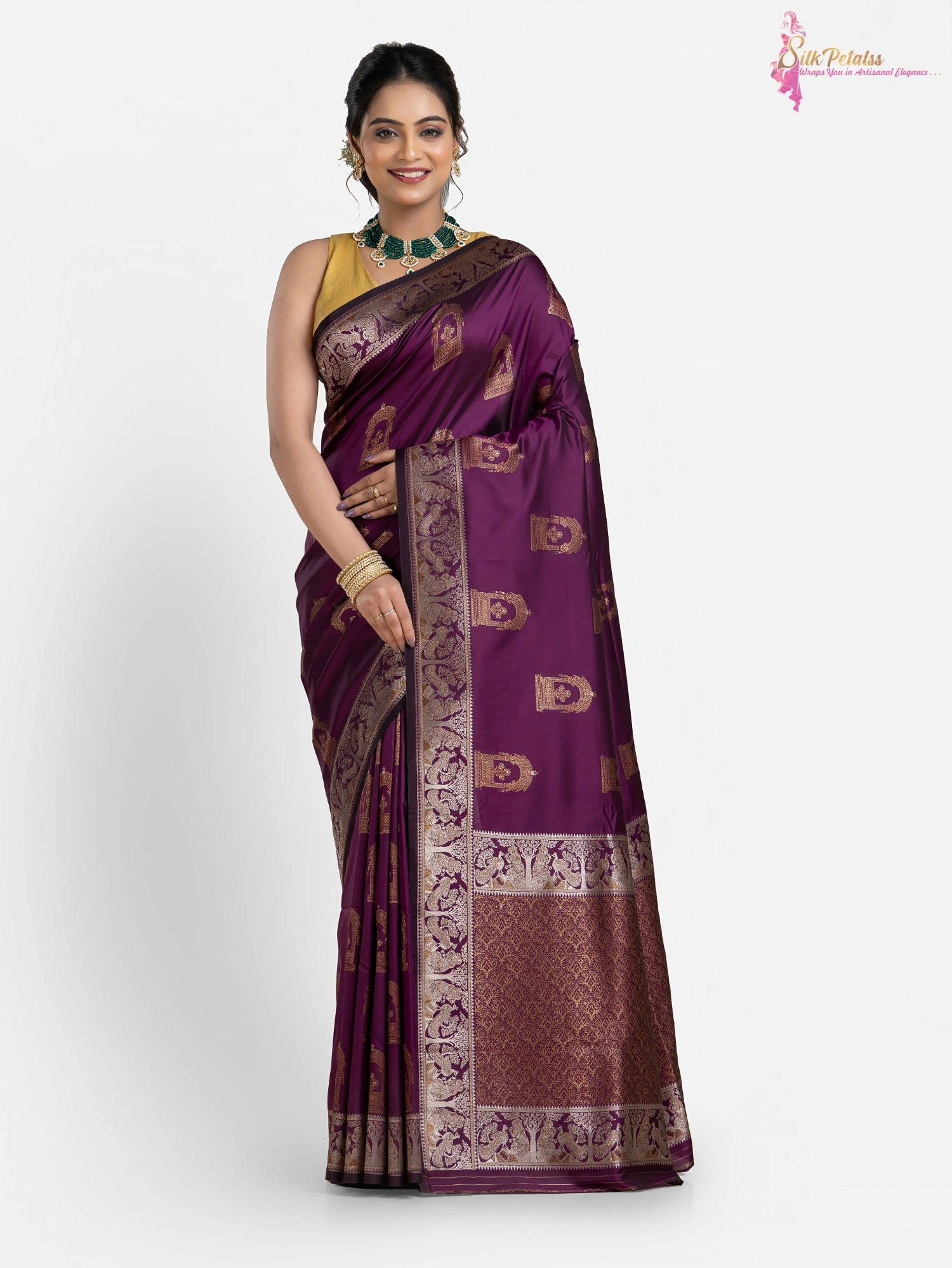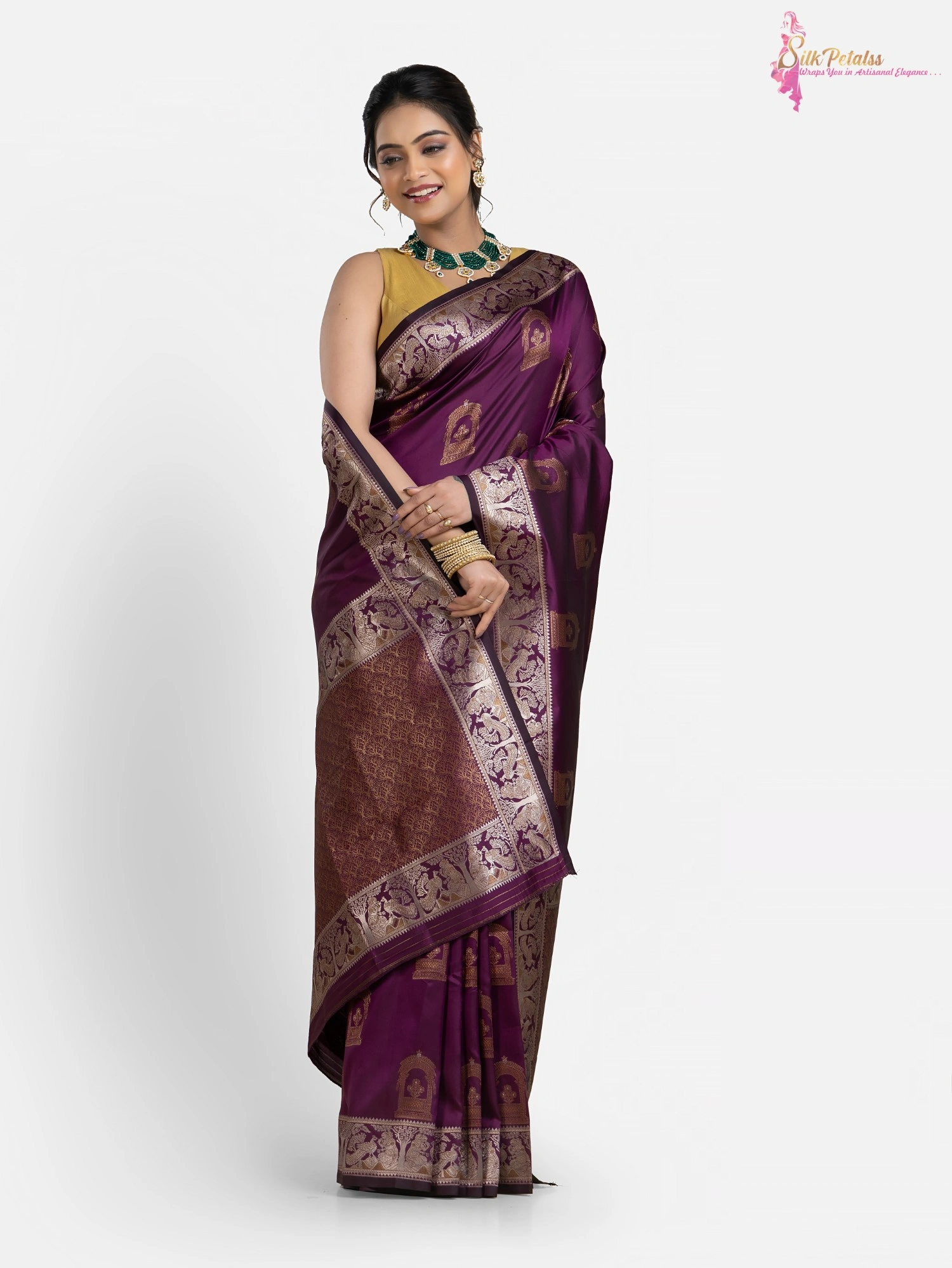 This handwoven Katan Silk saree in a soft purple colour has woven sona rupa butas all over in Baluchari pattern with a beautiful intricately worked border. Wear this very unique and stylish saree to those special occasions to stand out in a crowd.