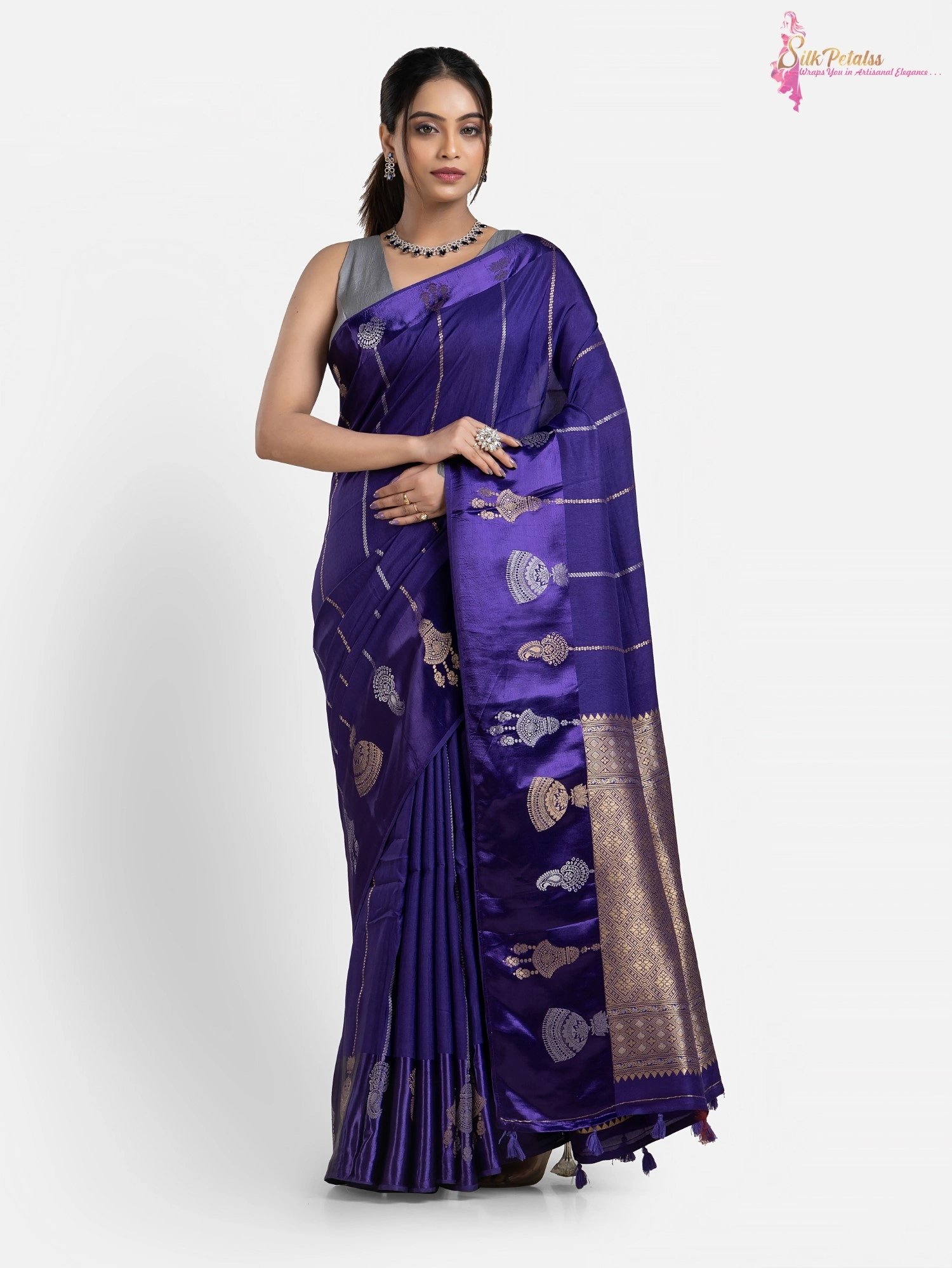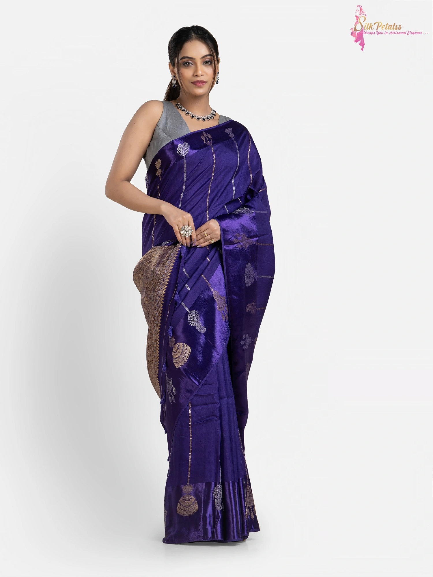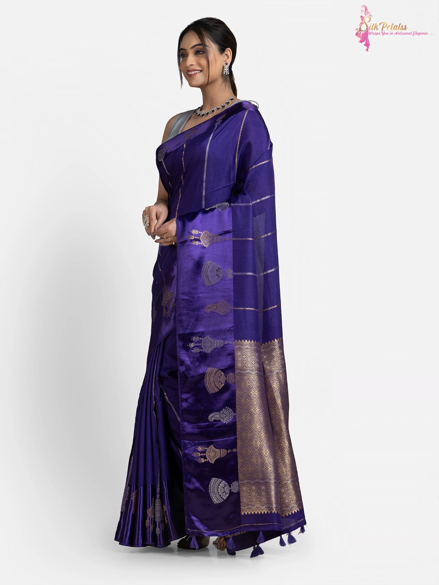 This Handwoven Raw Mango Silk Saree in a shade of blue has stripes all over in gold and silver colour . The saree has a woven Satin Benarasi border with a unique design. This very unusual saree is very elegant & stylish .