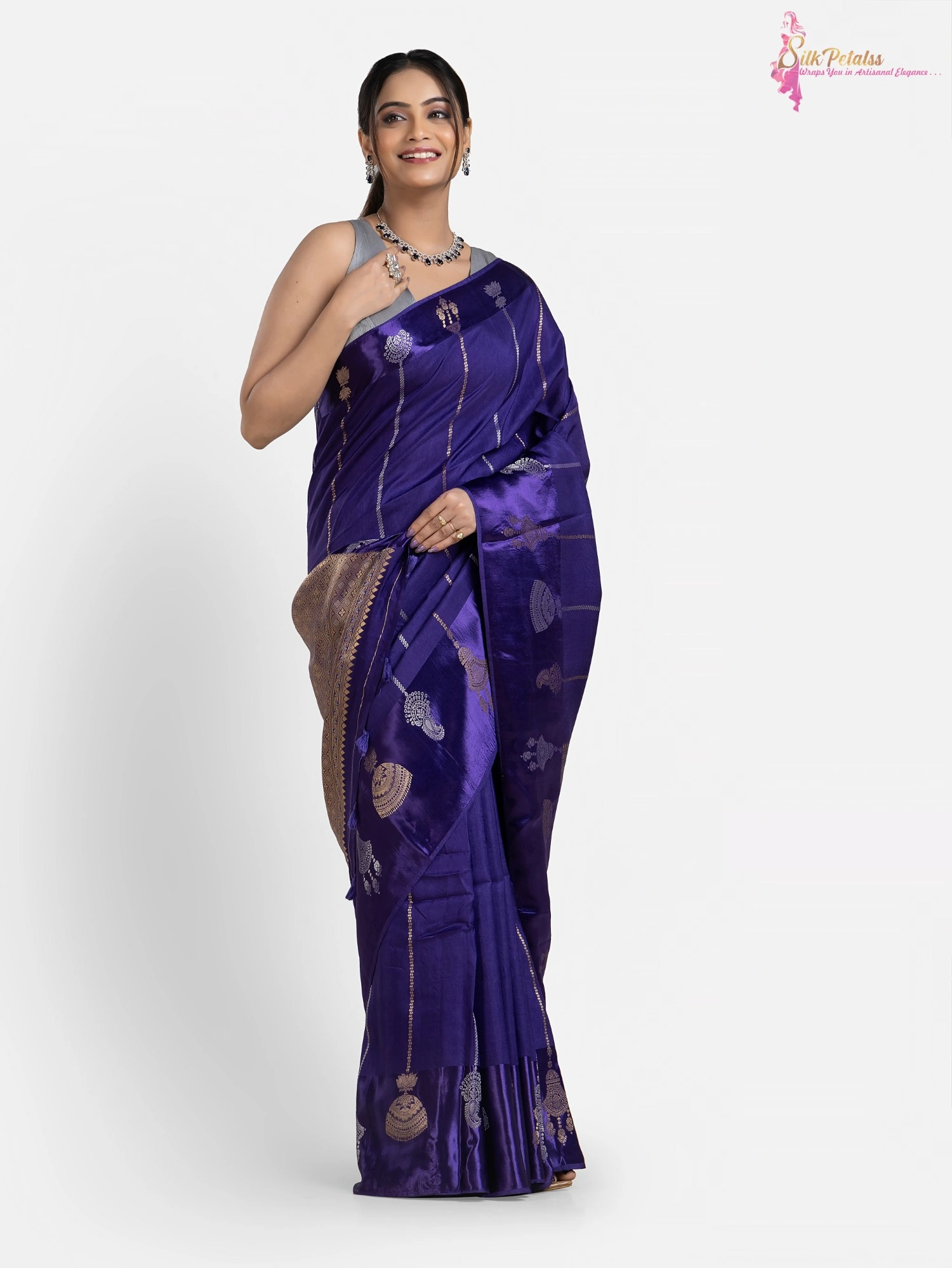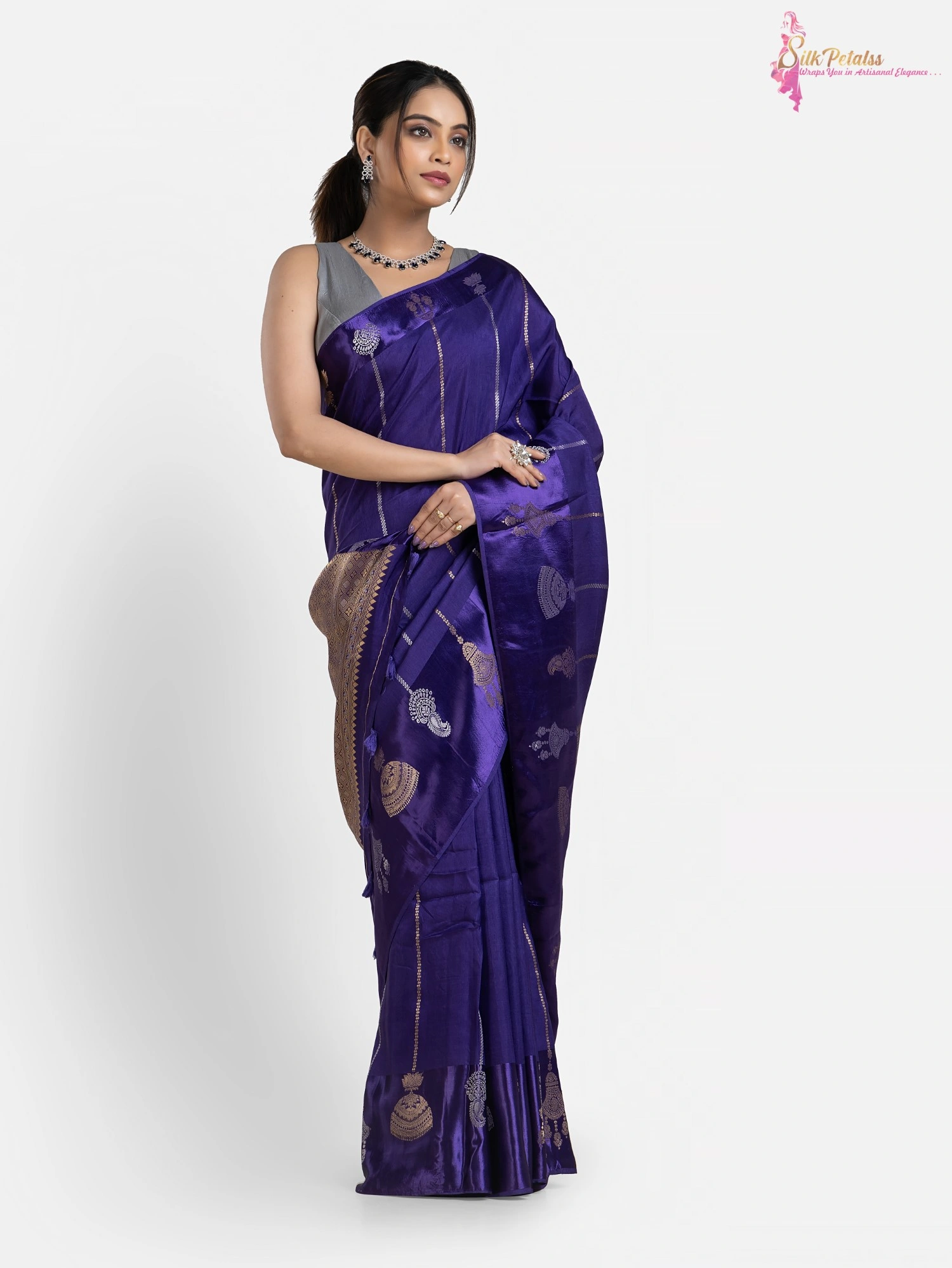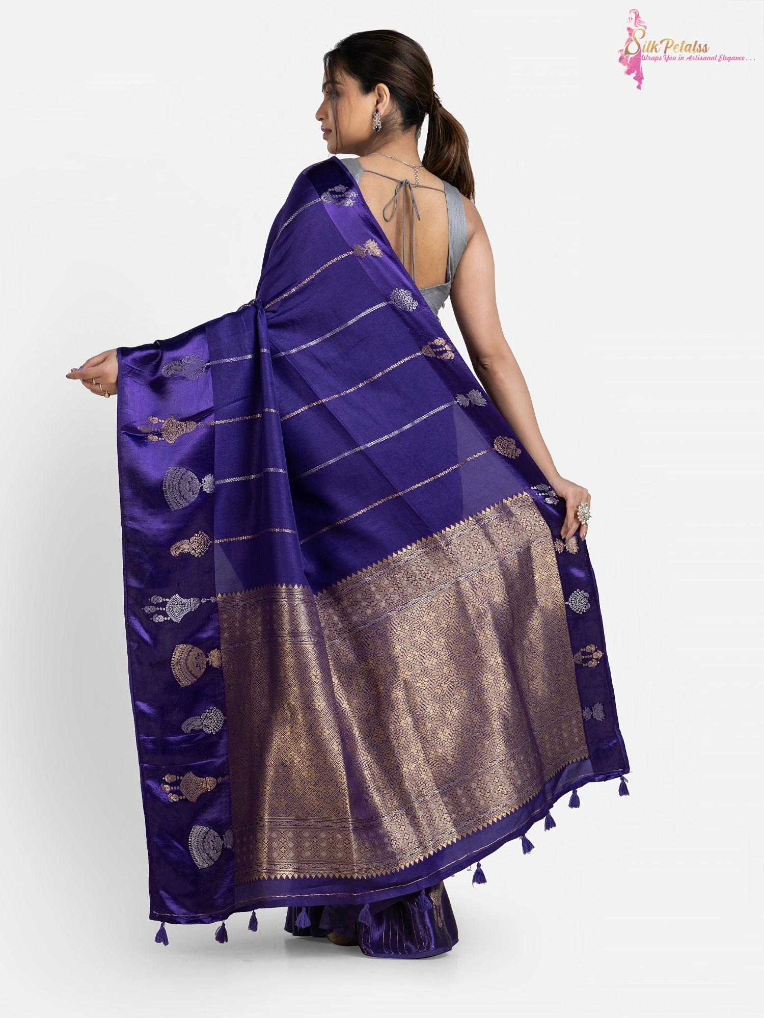 This Handwoven Raw Mango Silk Saree in a shade of blue has stripes all over in gold and silver colour . The saree has a woven Satin Benarasi border with a unique design. This very unusual saree is very elegant & stylish .