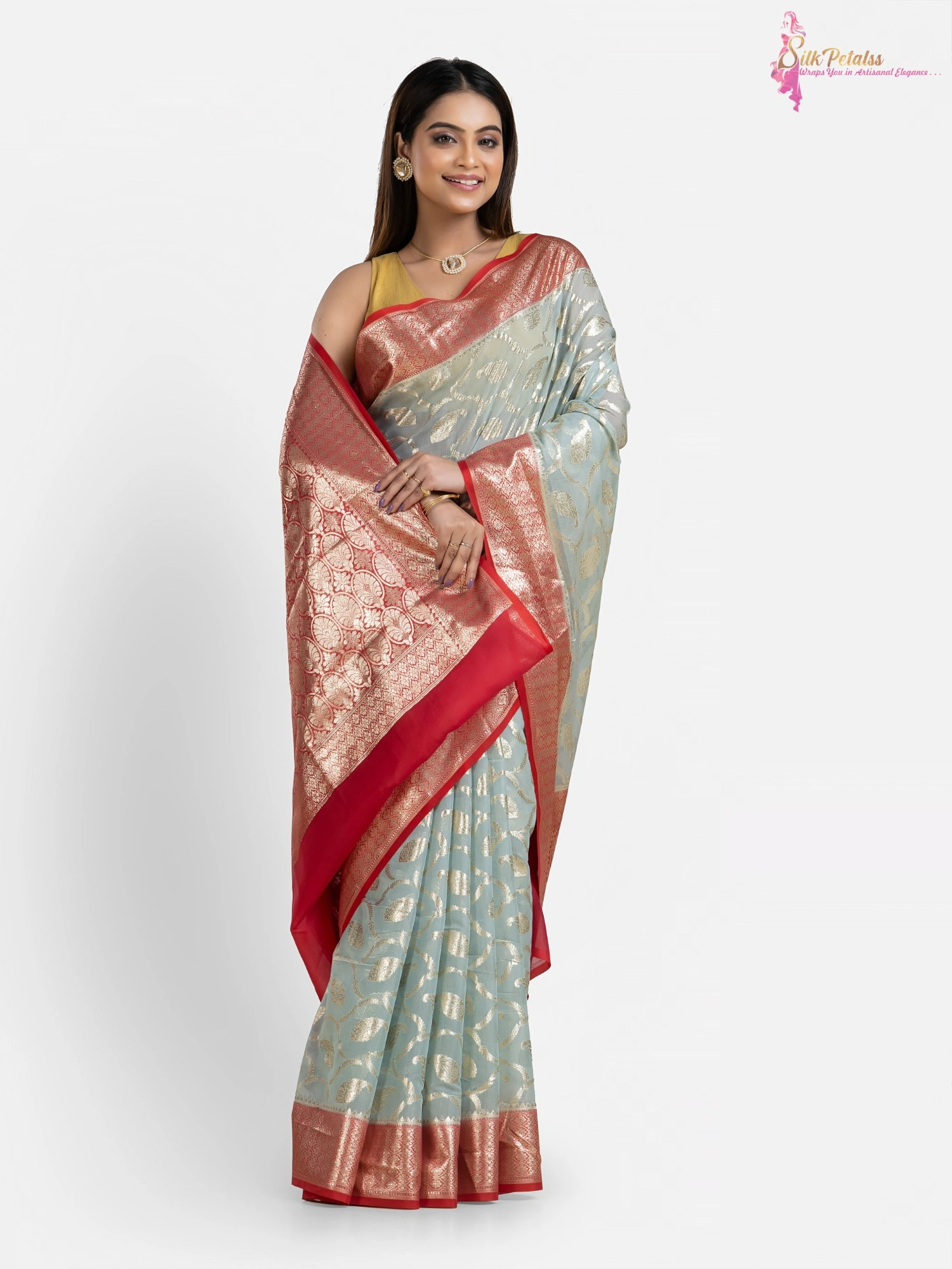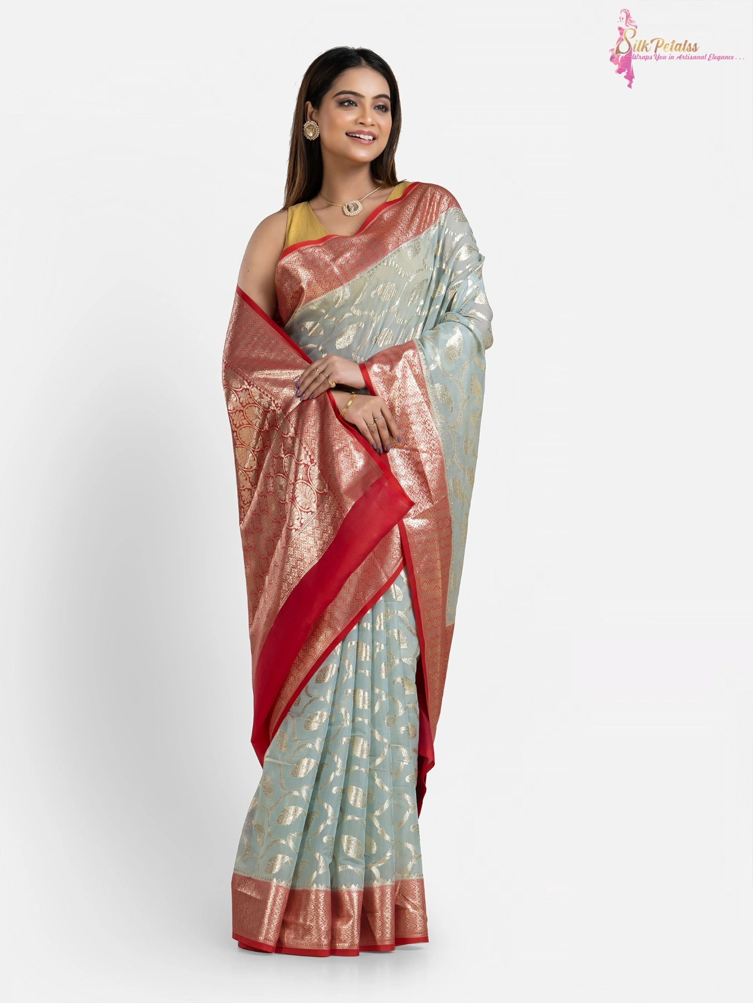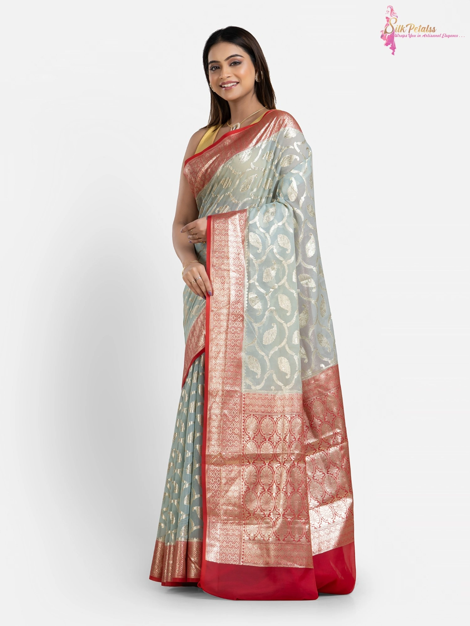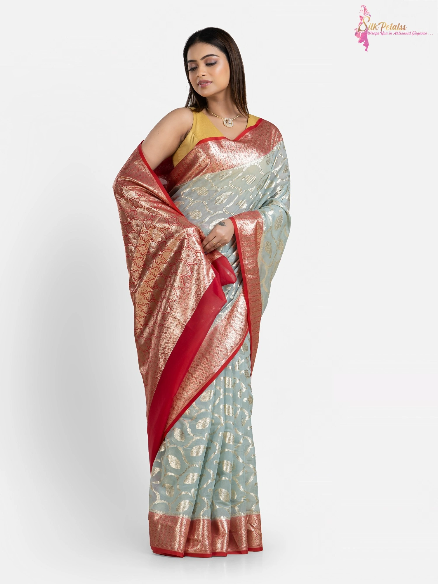 This handwoven Silk Cotton Benarasi saree from the weaves of Benaras in ice blue and red combination has all over Jaal pattern in silver . The saree adds so much elegance to your wardrobe.