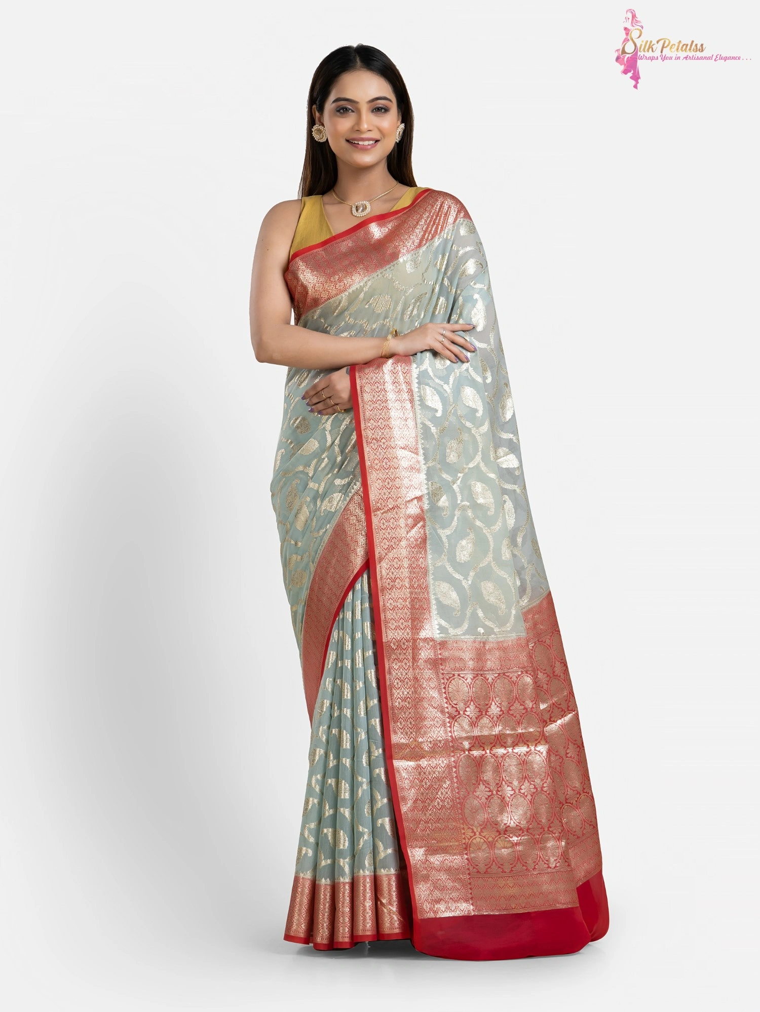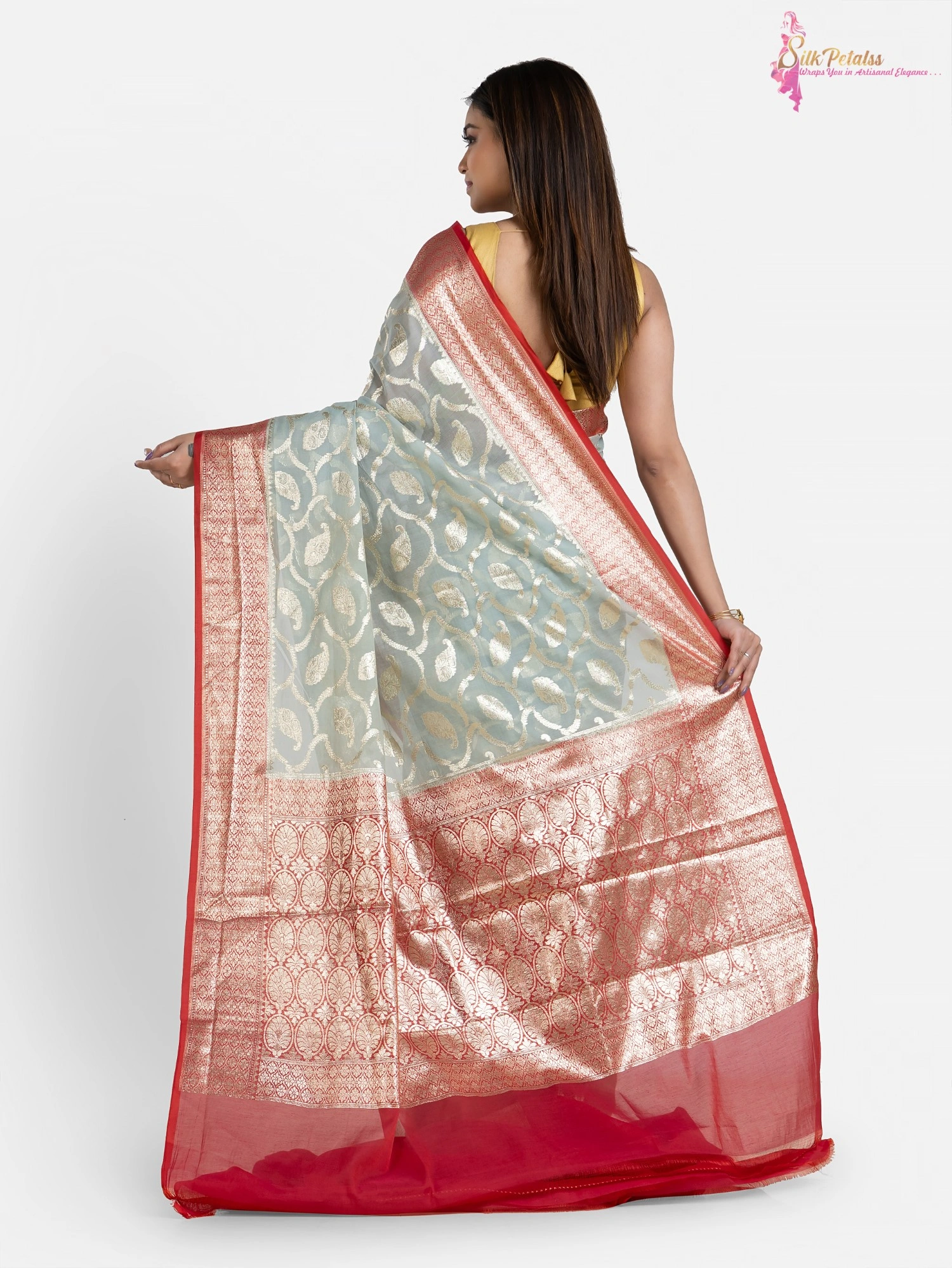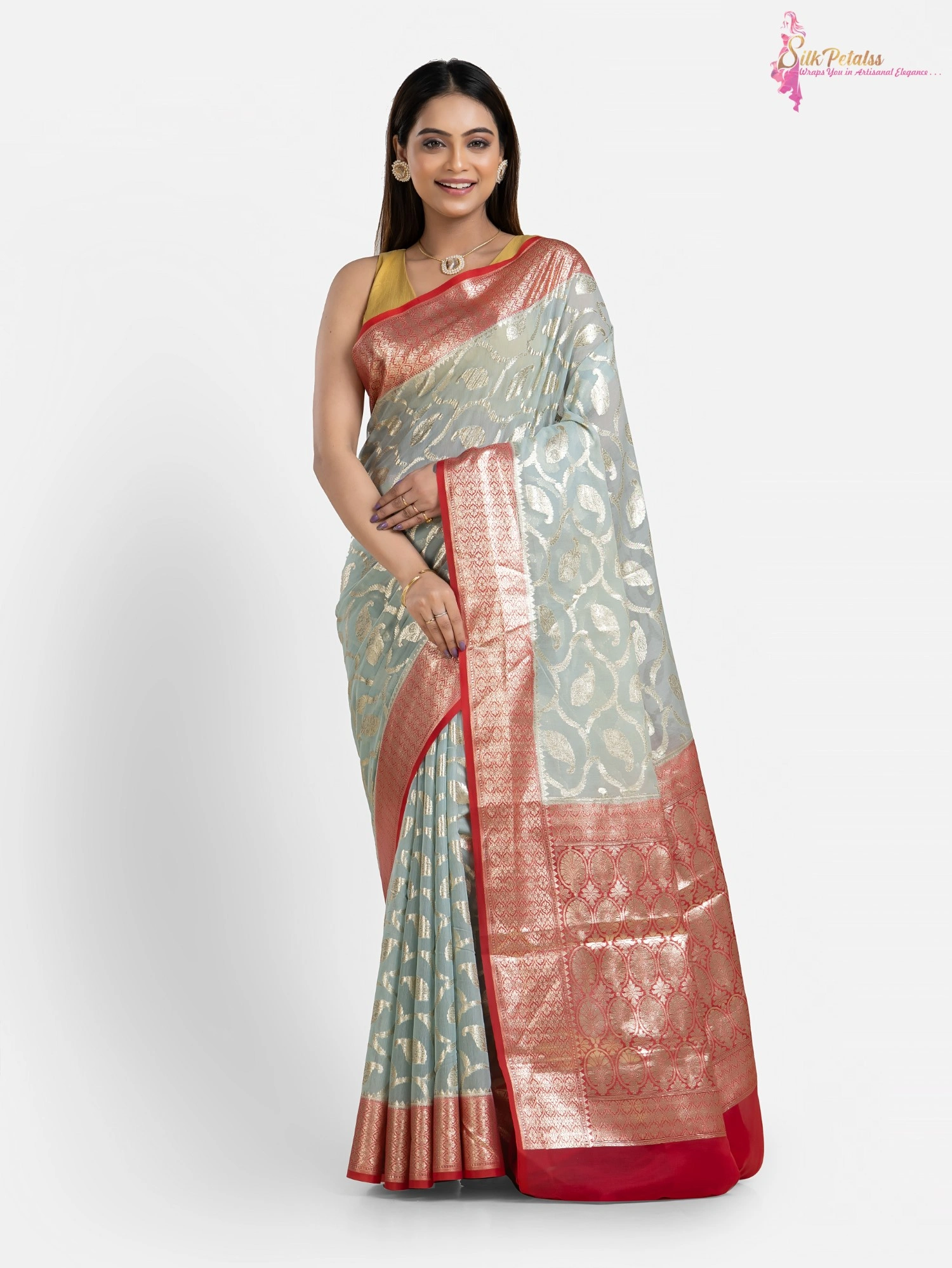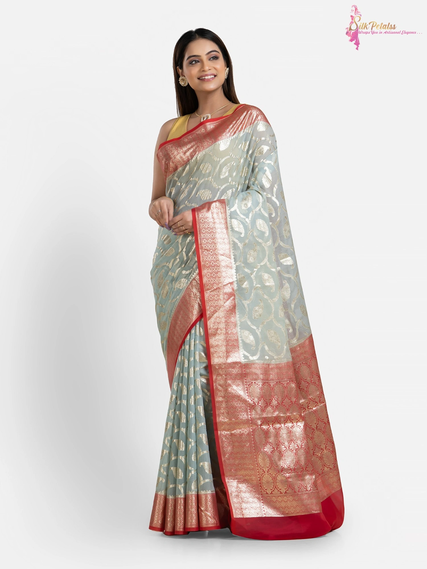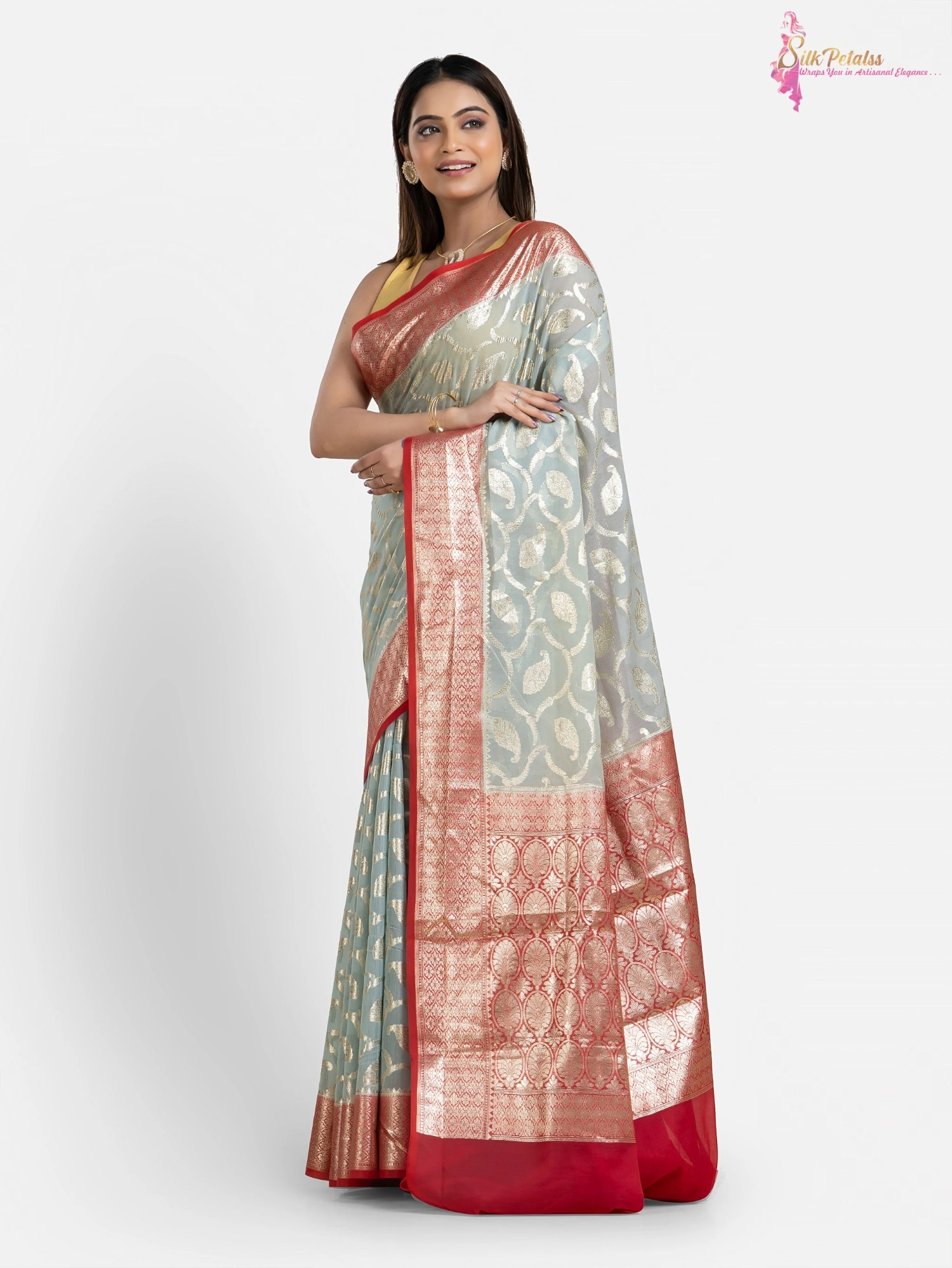 This handwoven Silk Cotton Benarasi saree from the weaves of Benaras in ice blue and red combination has all over Jaal pattern in silver . The saree adds so much elegance to your wardrobe.